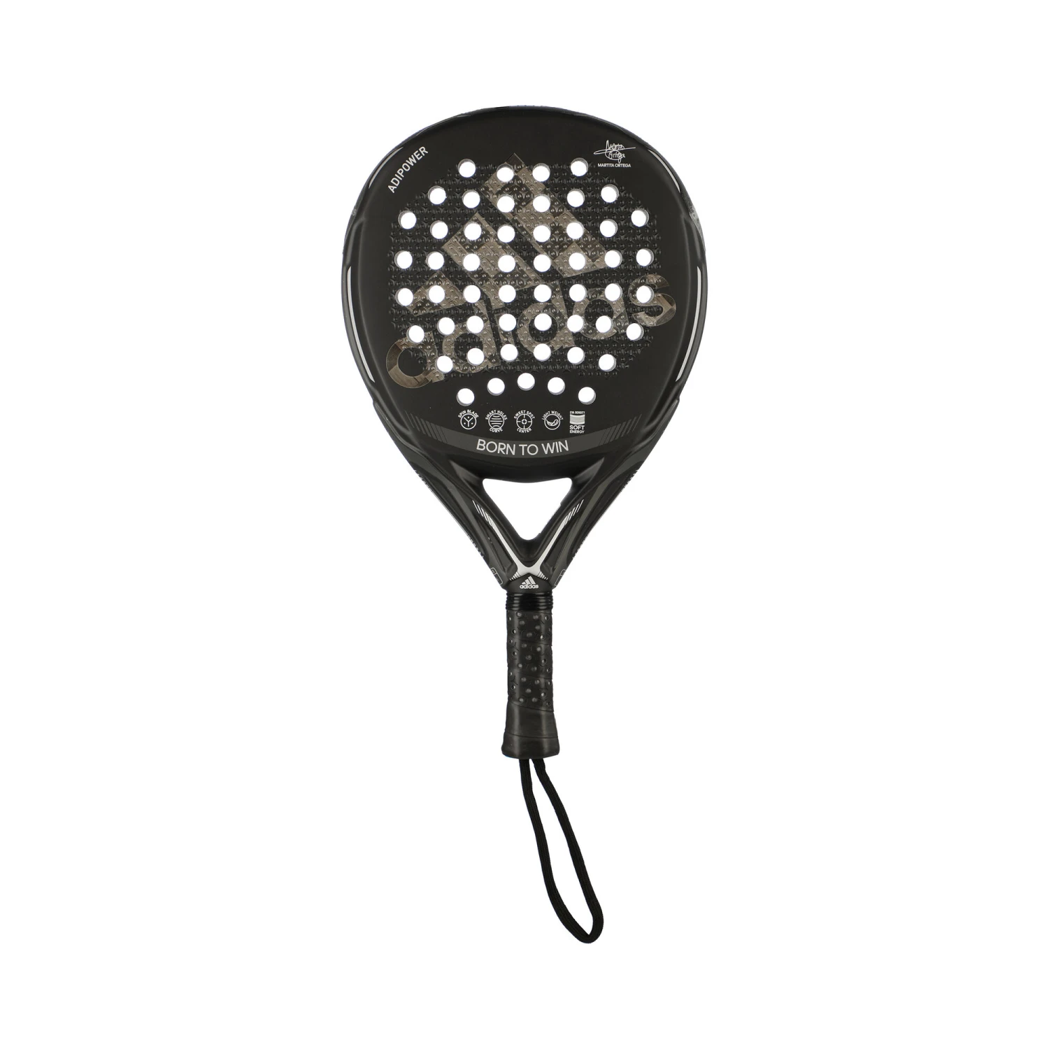 Discover what are your limits with the new Adipower Master by Martita Ortega. This racket has a unique design made to shine on the court. It surprises with its ball output and easy handling, thanks to its reduced weight and round format with sweet spot in the center. It featuresย Dual eXoskeletonย andย Power Embossedย Ridge technologies that give you extra power and rigidity in all your shots. The combination ofย Carbon Aluminizedย fiber and the intermediate density rubberย Eva Soft Energyย makes it a very comfortable racket when hitting without sacrificing power. Theย Spin Blade, which is the roughness engraved in the mold of the racket, will help you to deceive your opponent by providing the best effects to the ball. A racket that allows you to play differente. To be unique.