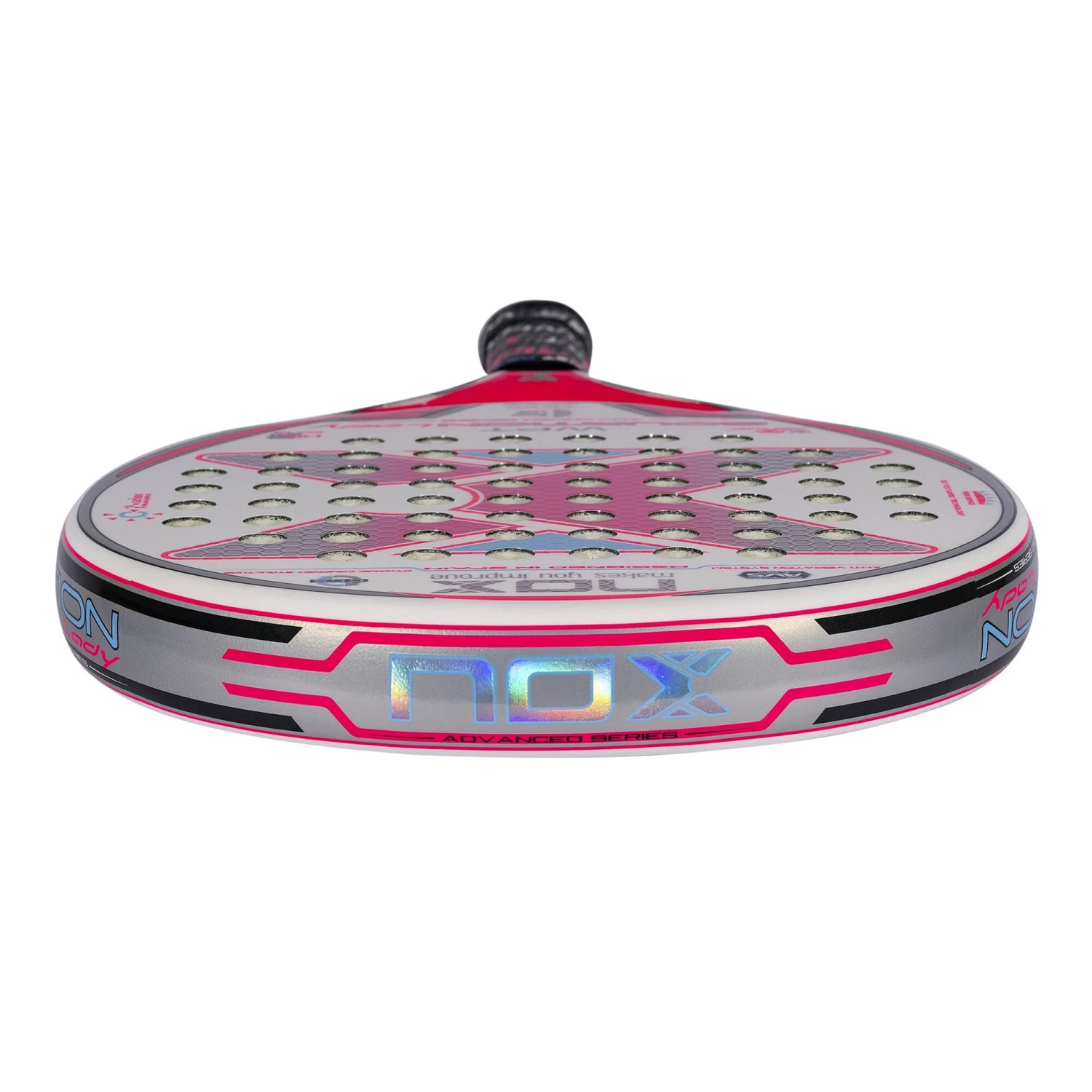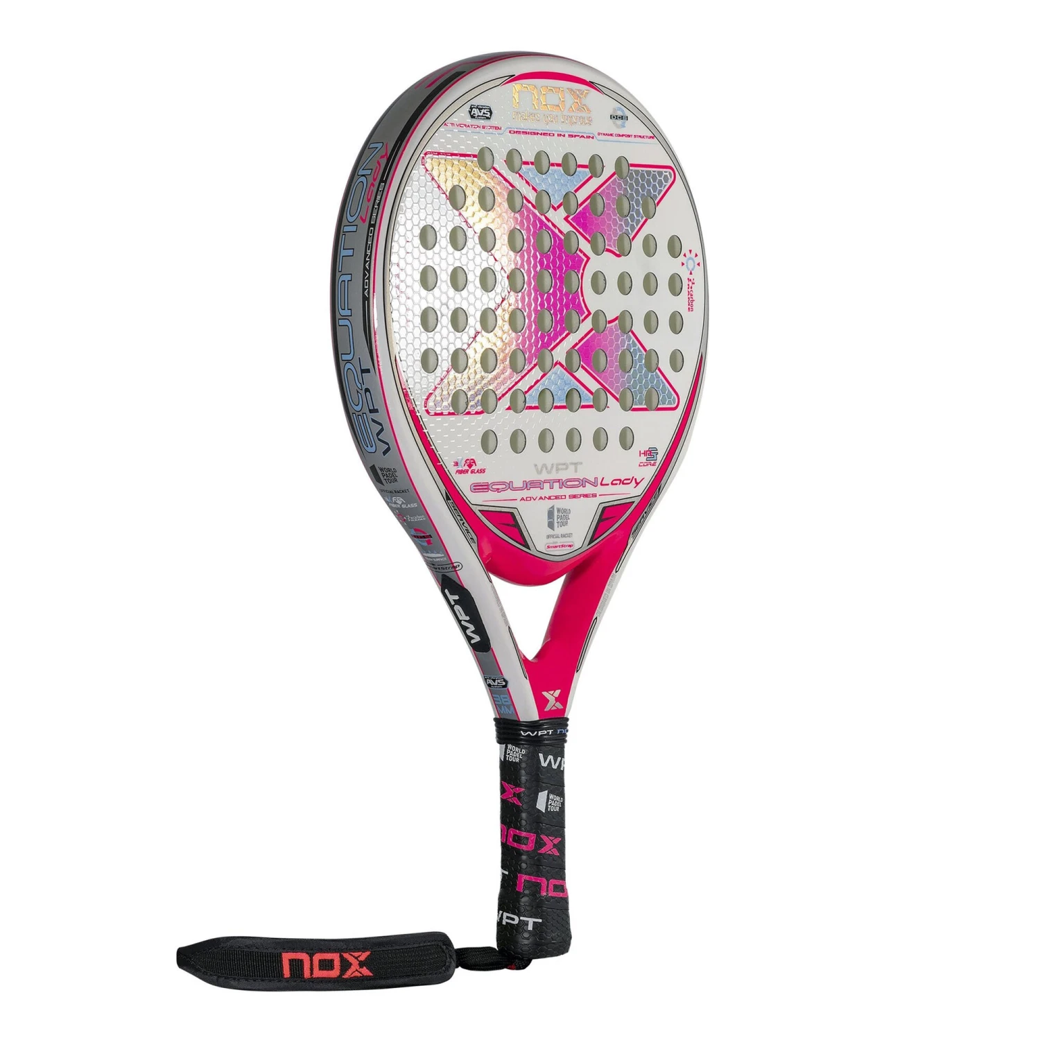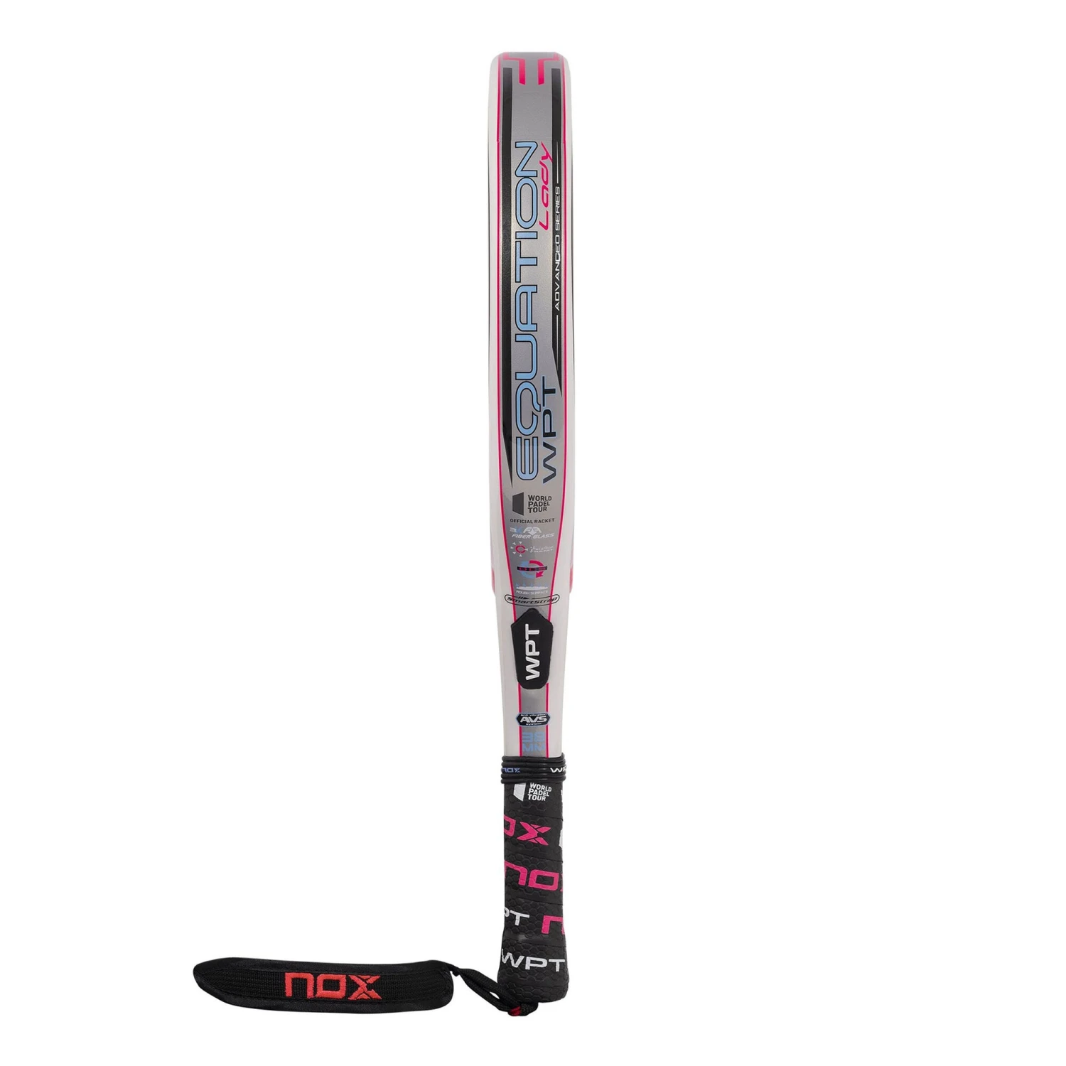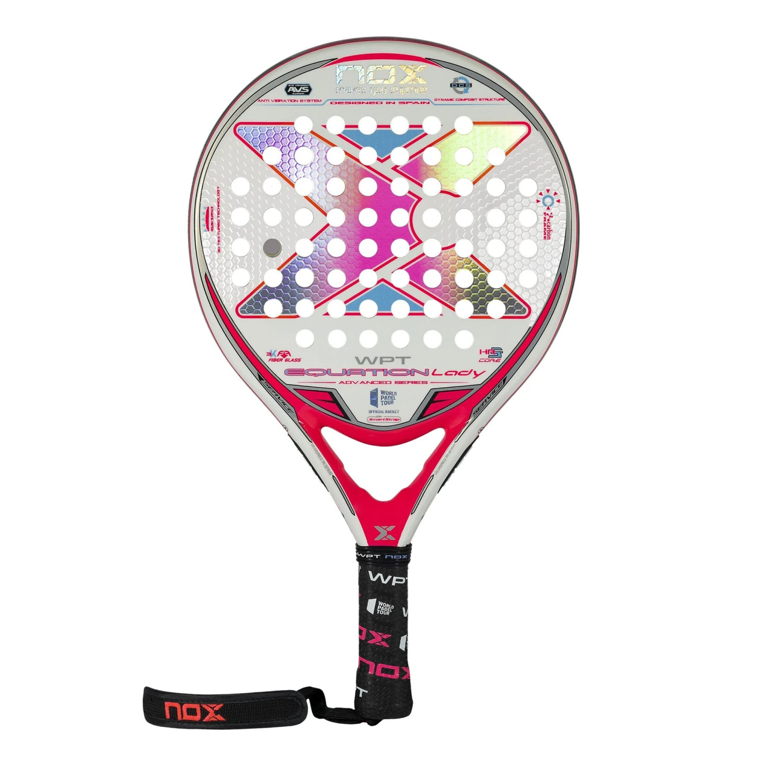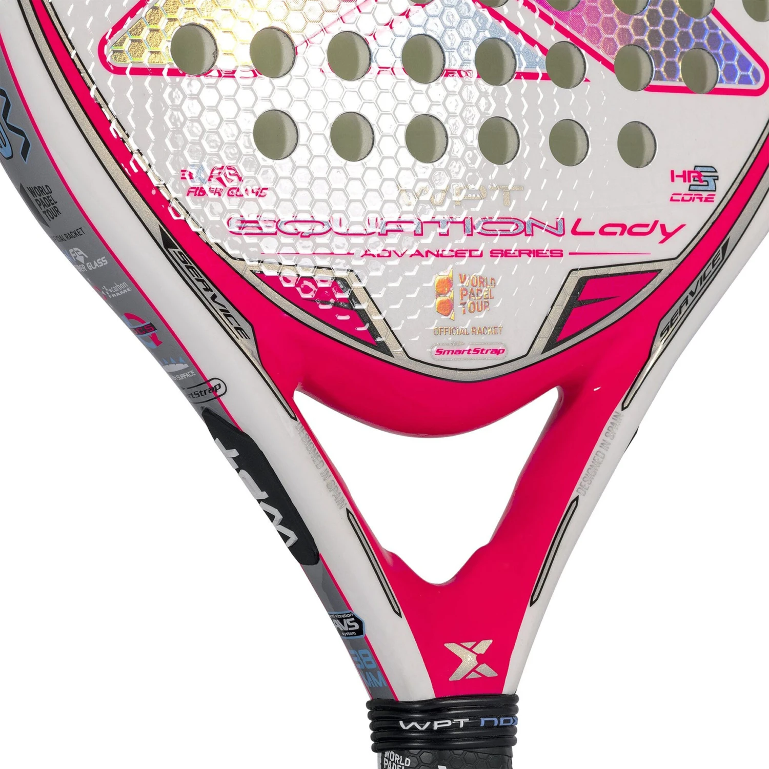 The Nox Equation Lady WPT Edition 2022 is the perfect combination of manageability, control and precision. The Lady version is the same as the “”Equation WPT Edition 2021″” modifying the aesthetics and weight, which is less, between 350-365 grams. It is a padel racket with a round format, medium balance and a very wide sweet spot that provides great playability. It is composed by high quality materials which offer the best performance on the track: 100% carbon frame, 3K fiberglass faces and high-density HR3 rubber core.