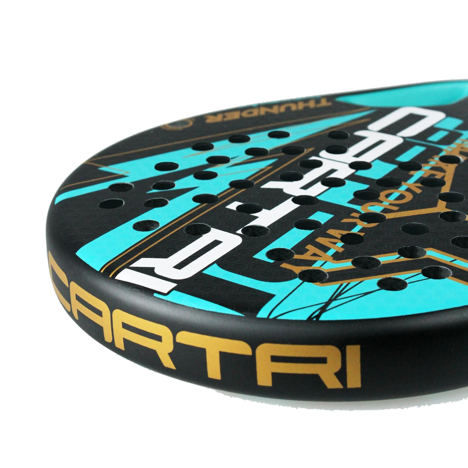 The new Thunder Gold padel racket is a teardrop-shaped racket with in a mid-high balance. It is composed of hybrid faces ofย Carbon Aluminium and Carbon, and the core of Eva Soft Black rubber. This composition allows to have a good ball output while maintaining a high level of precision in the strokes. The frame of the racket is 100% carbon, providing greater rigidity and durability, and at the same time reducing the vibrations of the blade.